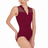 The mix of materials makes this leotard a modern choice with gorgeous detailing including a V-back lace panel and front zip opening