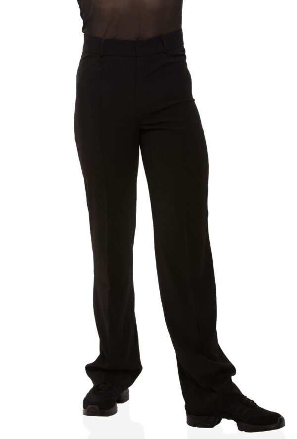 Male formal tailored costume trousers with high waist, 4cm waistband with belt loops, zip fly and stitched front seams. Comprised of stretch fabric for freedom of movement. 90% polyester 10% elastane,