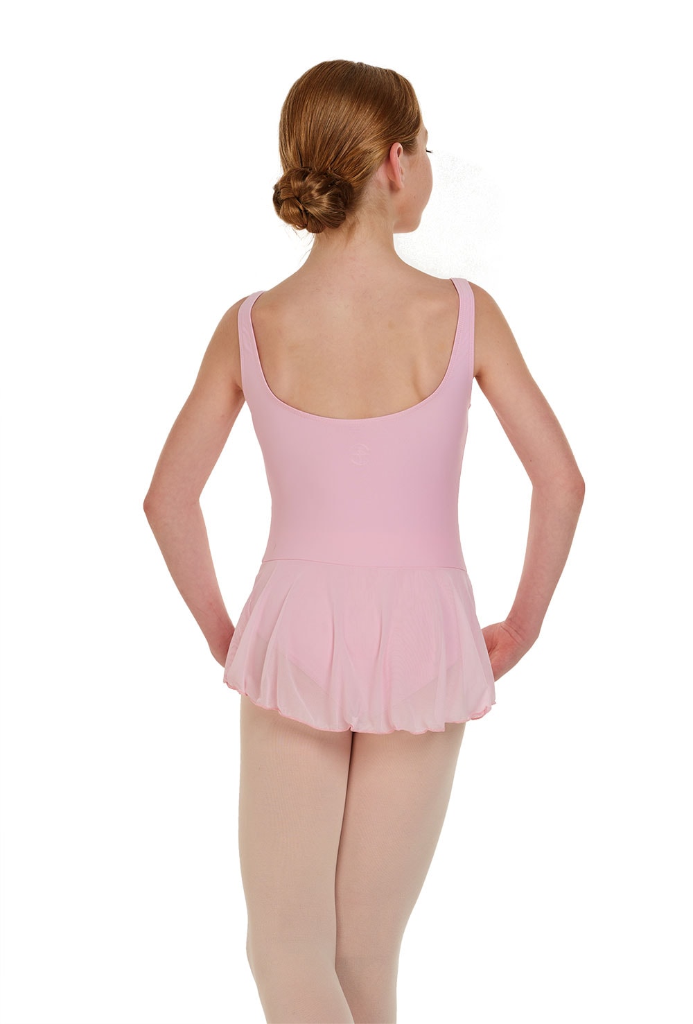 - Tank strap leotard with integral semi-opaque skirt