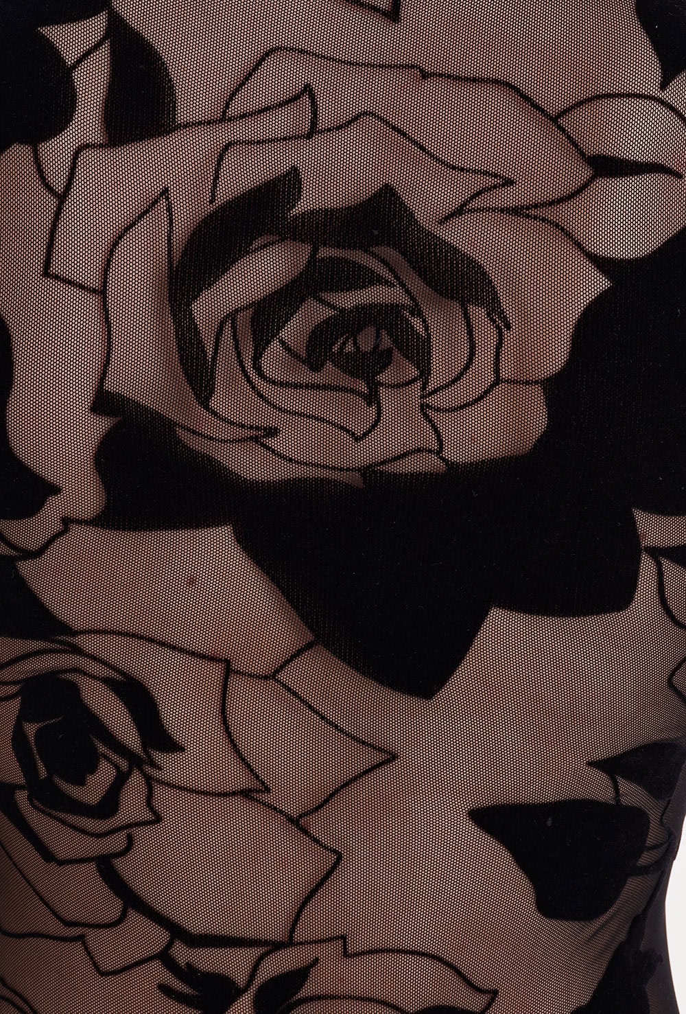 • Sheer flocked floral mesh tulle arms and back, transparent down to the waistline
