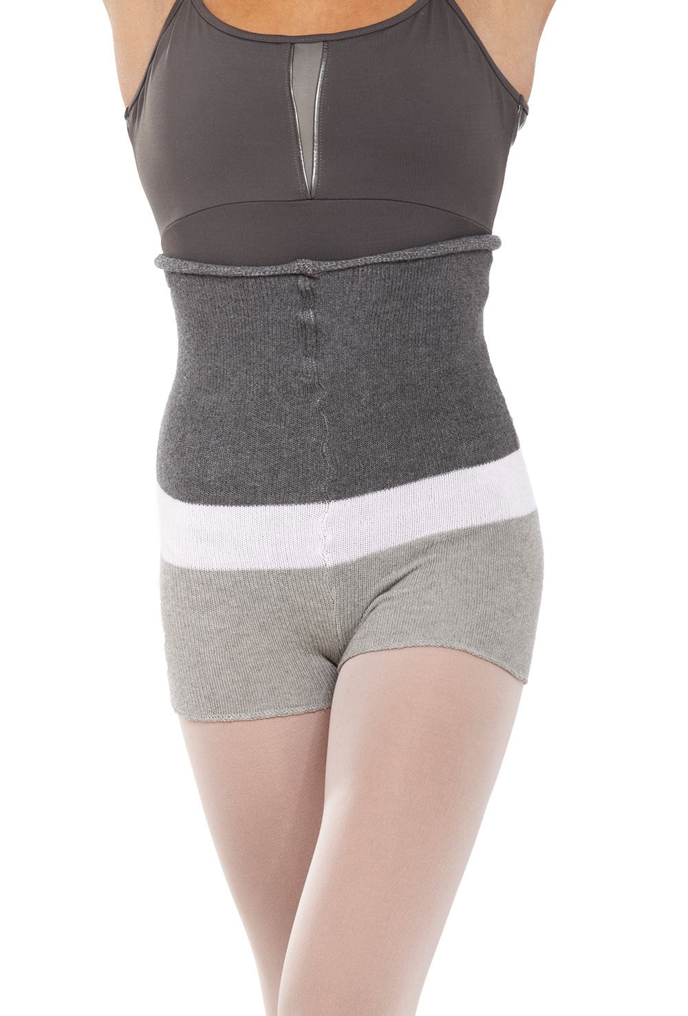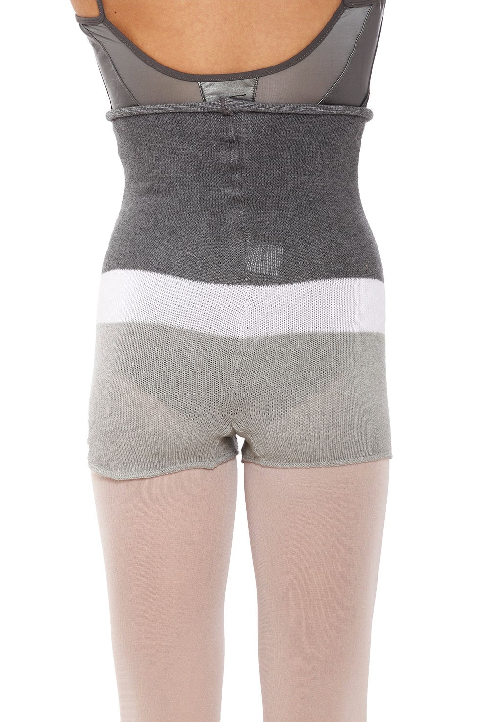 Fine knit warm-up shorts with fun stripes and roll down waistband. 90% cotton 10% elastane.