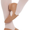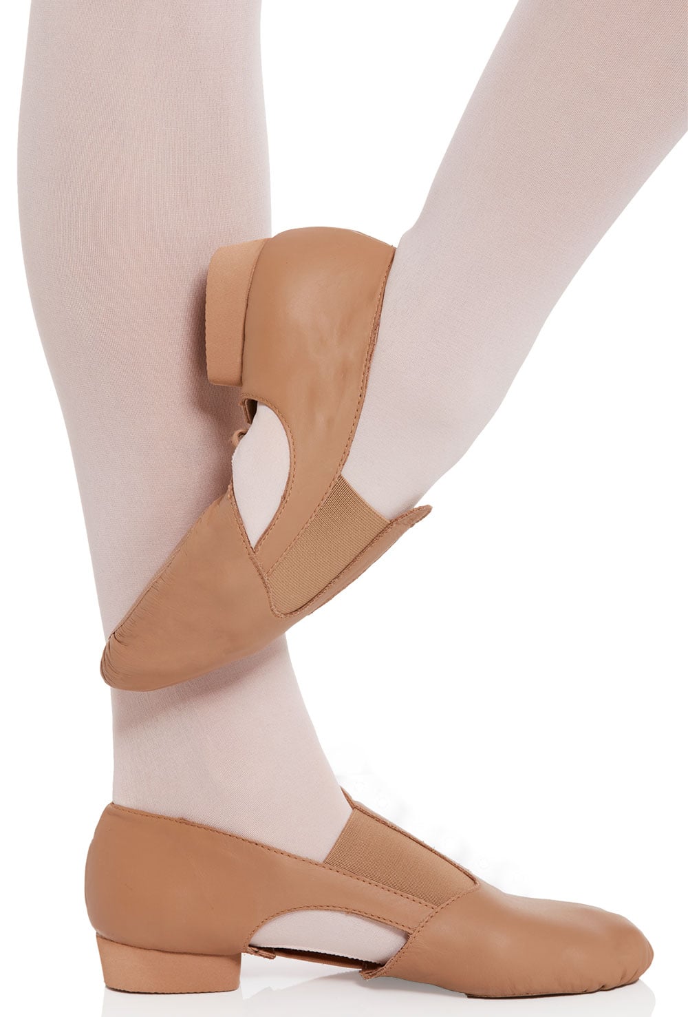 Versatile dance sandal with supple leather T-bar upper with elastic vamp inserts and cotton lining. Features split rubber sole with under arch elastic and low heel.