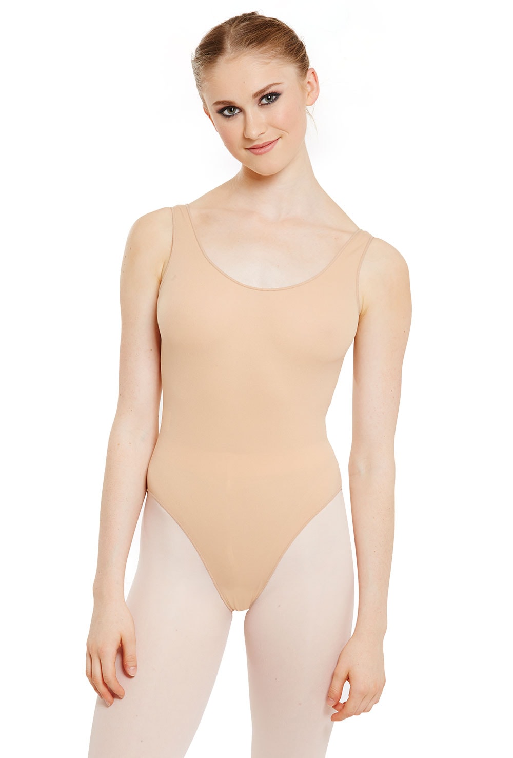 Seamless, nude, tank strap bodystocking for under leotard modesty layer. Features round neckline and low scoop back. 100% polyamide