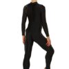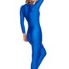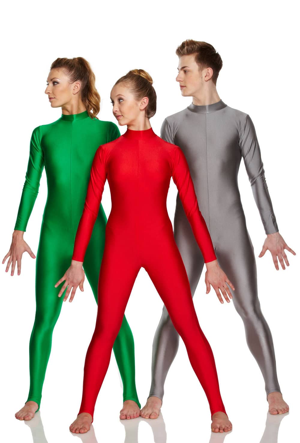 Unisex, long sleeve, polo neck unitard with zip opening at the back and stirrup to hook under the foot.
