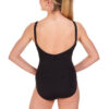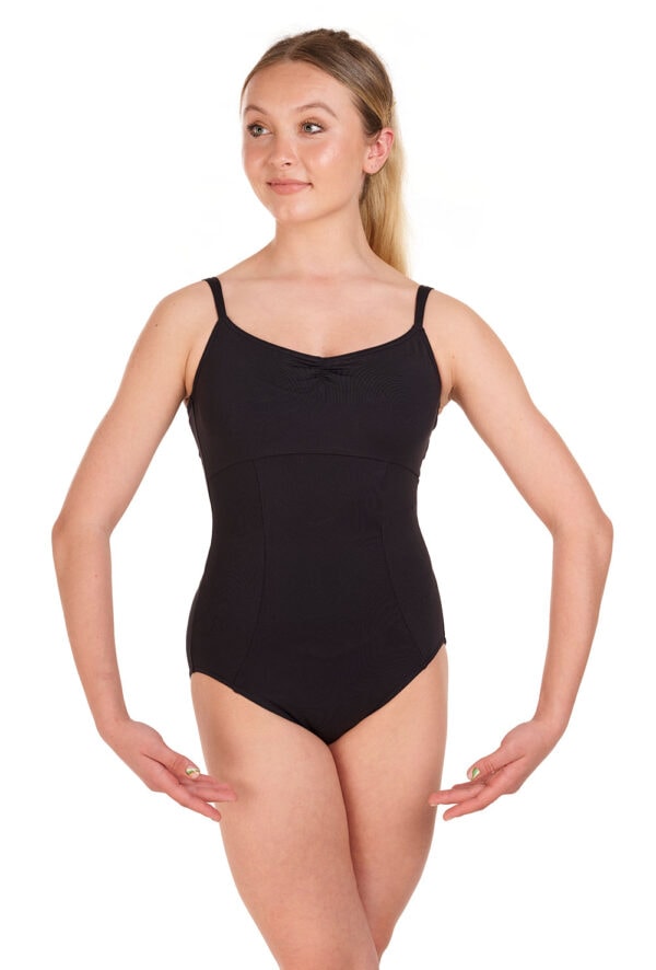 Tapered strap leotard with under-bust empire line, front princess seams and ruched front and back. Features bra modesty lining. 90% nylon 10% spandex.