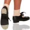 Economy tie-tap made of soft and supple synthetic leather with absorbent microfibre lining. Features Achilles notch for comfort and elastic straps that connect eyelets for easy lacing. Fitted with Tele Tone Jr. toe and heel taps.