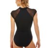 One of our best selling leotards, the raglan sleeve in contrast fabric gives a lovely angle to the shape of the shoulders. Wear the zip up or down depending on your mood!