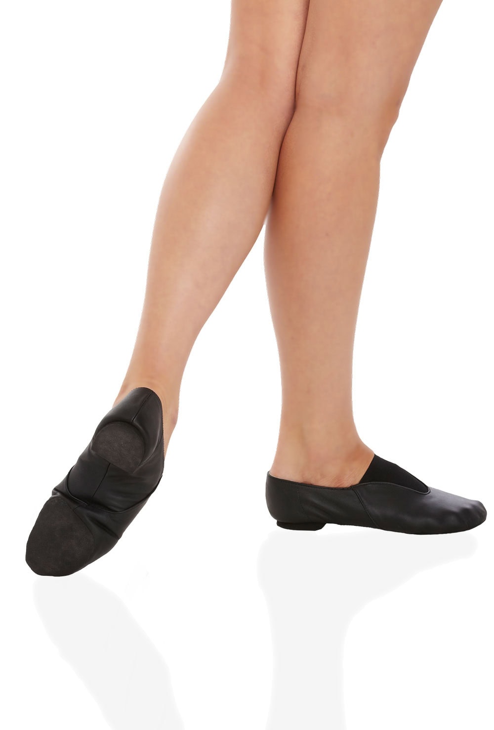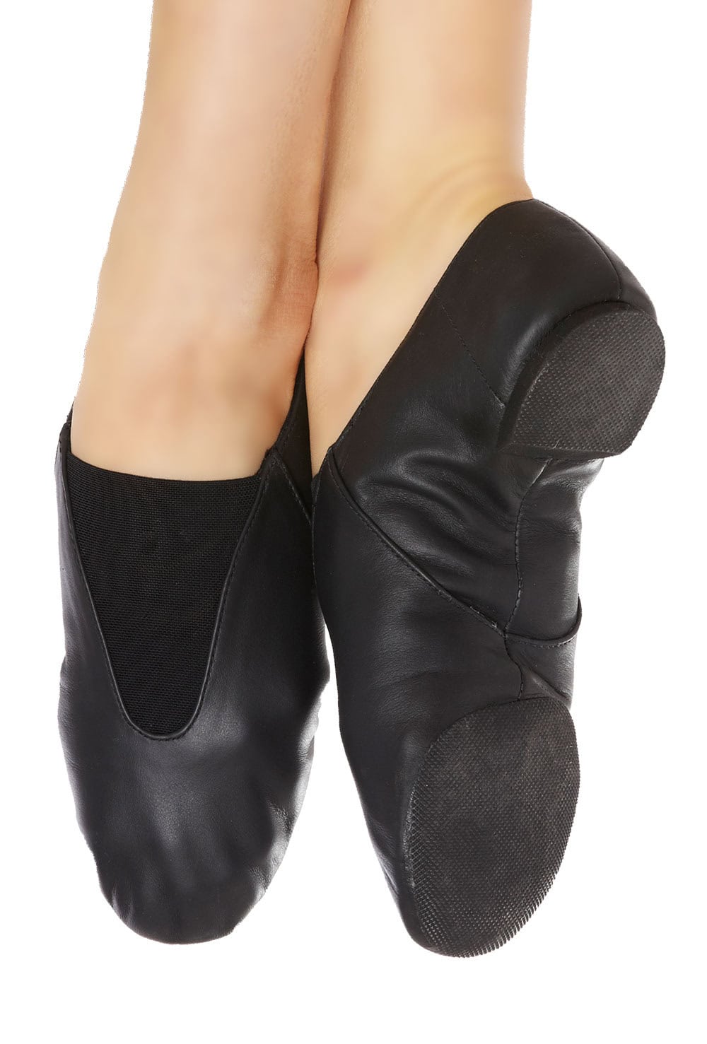 Value pull-on jazz shoe with elastic mesh vamp panel. Features soft leather upper, rubber split sole and full sock lining.