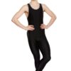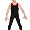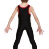 Male shiny lycra tank unitard with scoop neck and contrast binding. Features stirrups to hook under the feet. 80% nylon 20% lycra.