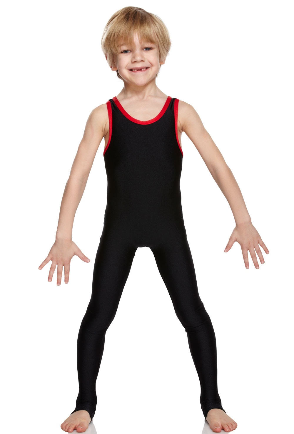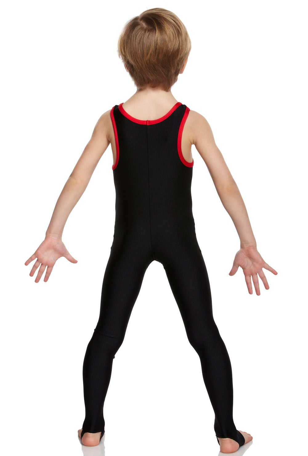 Male shiny lycra tank unitard with scoop neck and contrast binding. Features stirrups to hook under the feet. 80% nylon 20% lycra.
